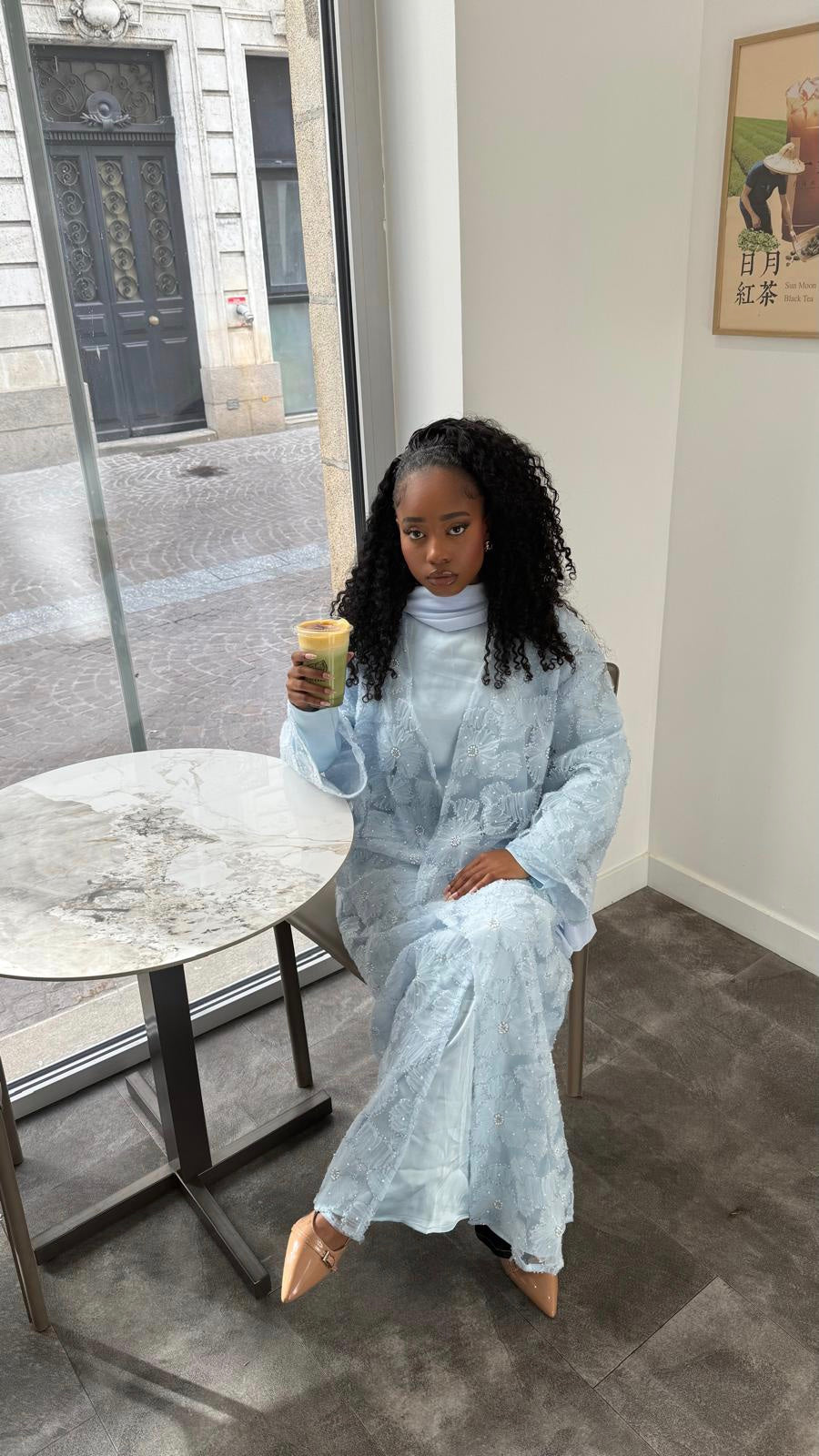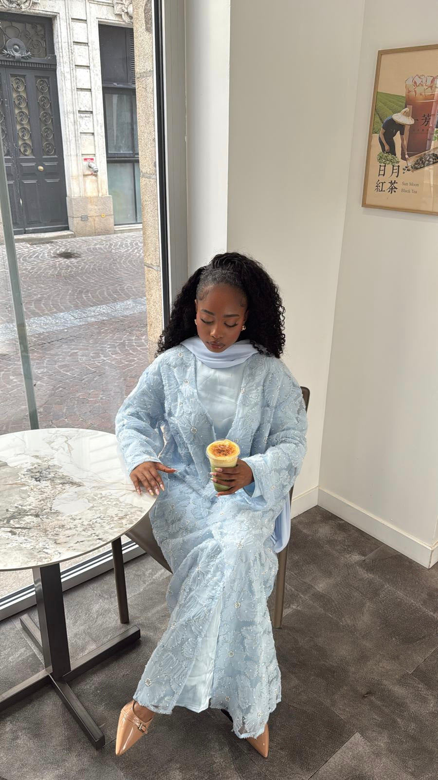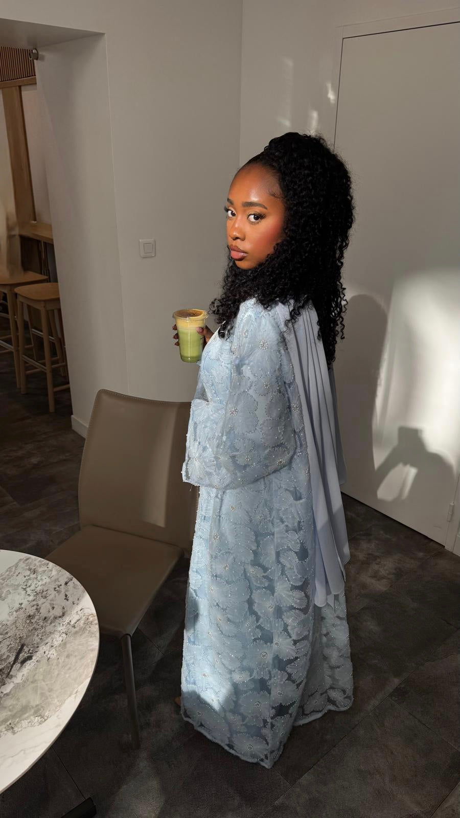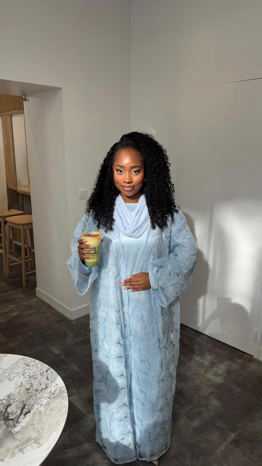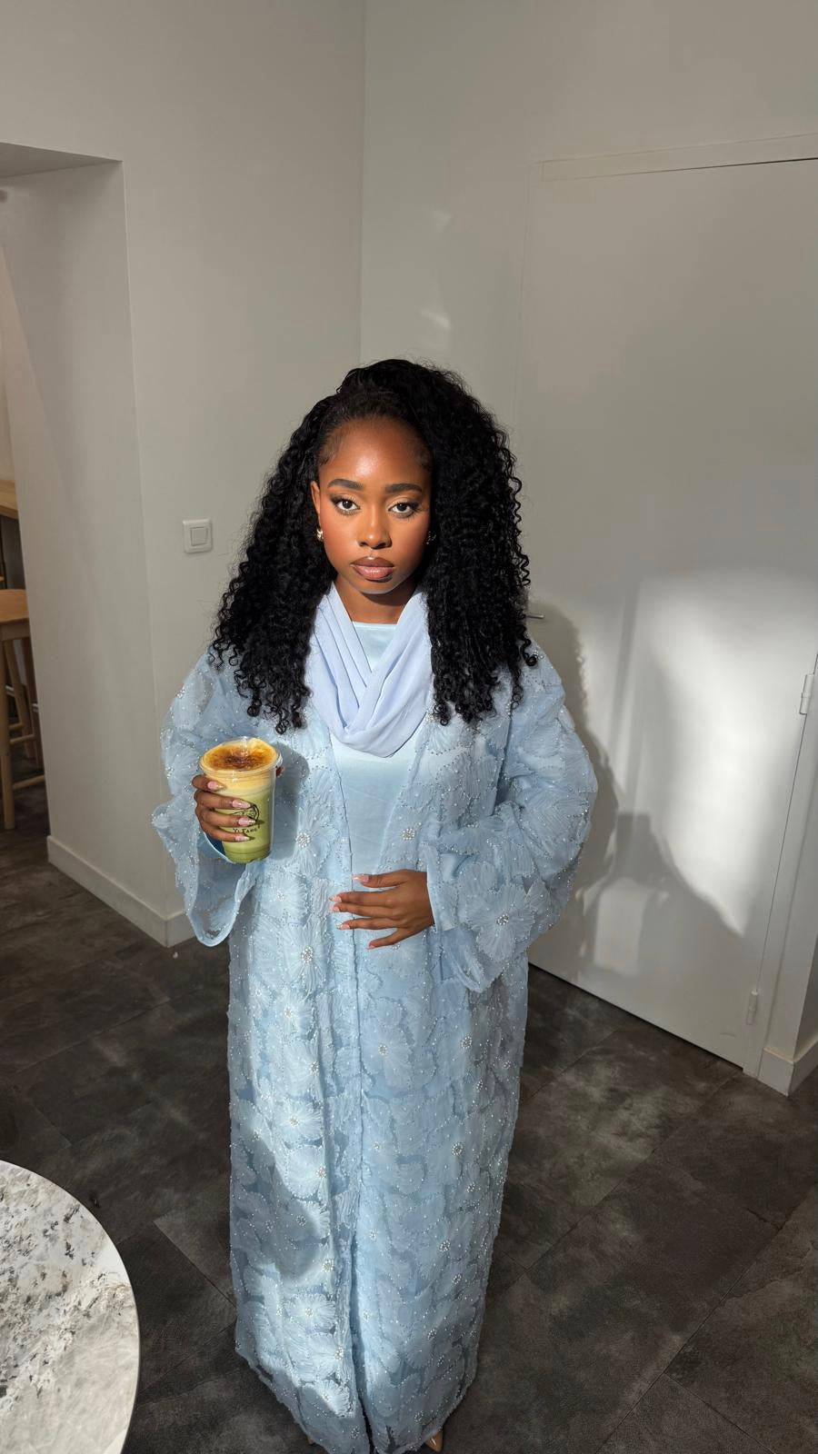 Un set trois pièces bleu tendre composé d’un kimono fluide, d’une sous-robe légère et d’un hijab assorti. Entièrement brodé à la main, il apporte élégance et douceur, idéal pour vos occasions spéciales ou au quotidien.