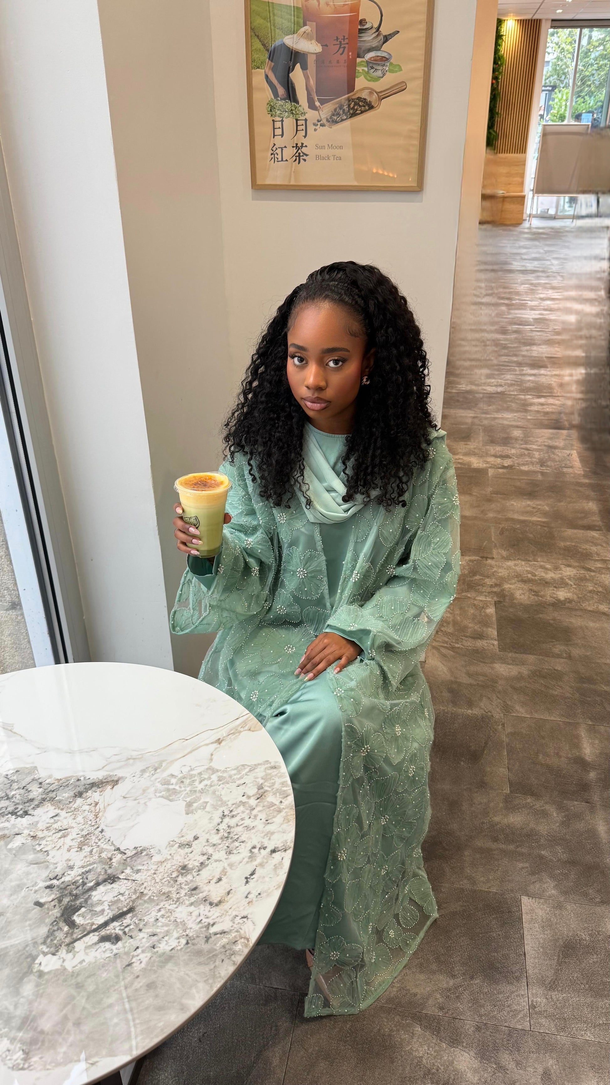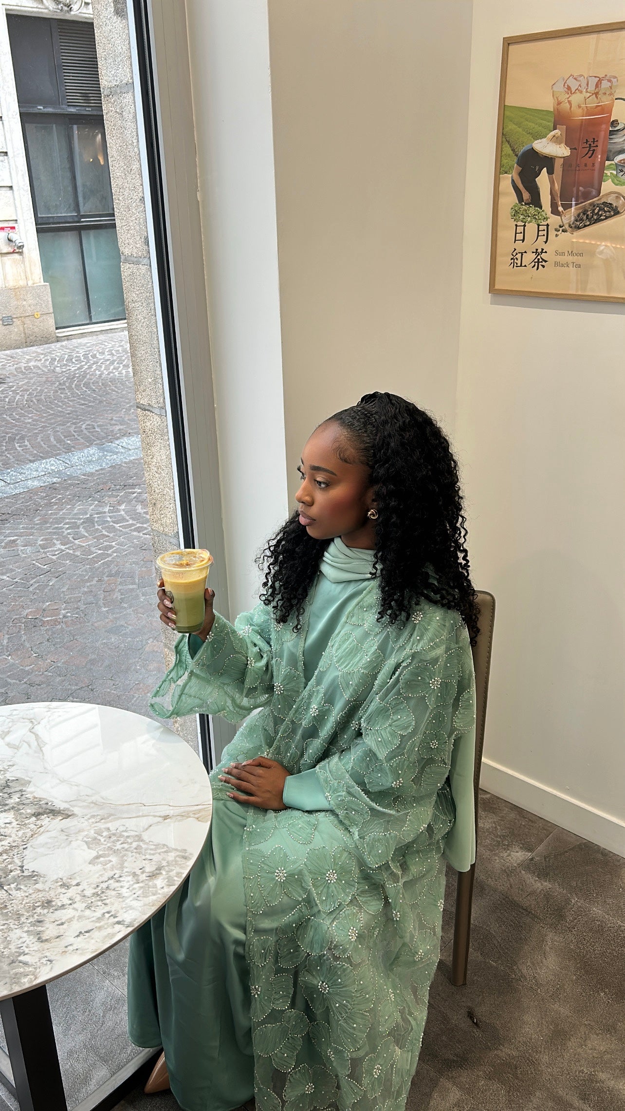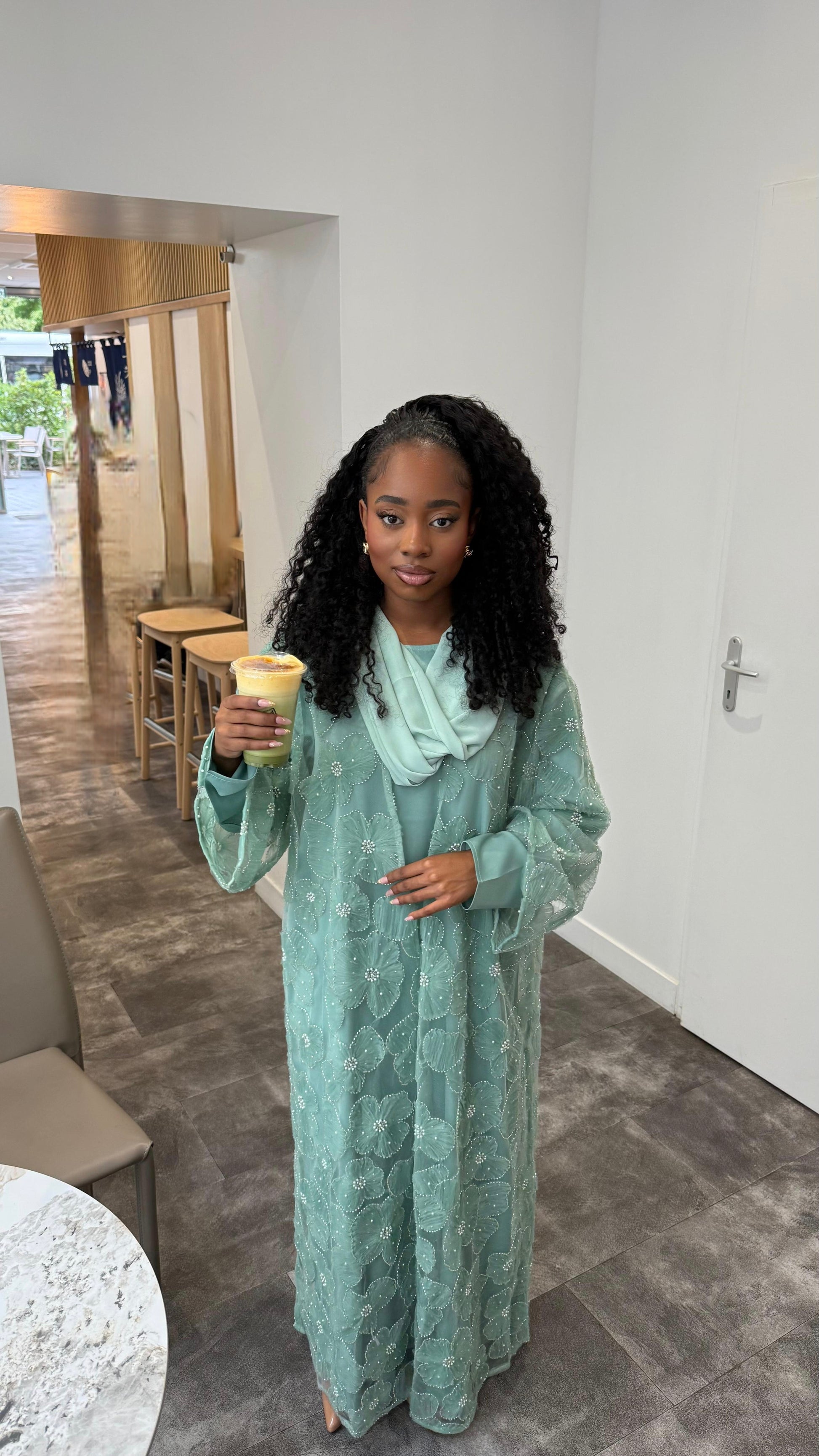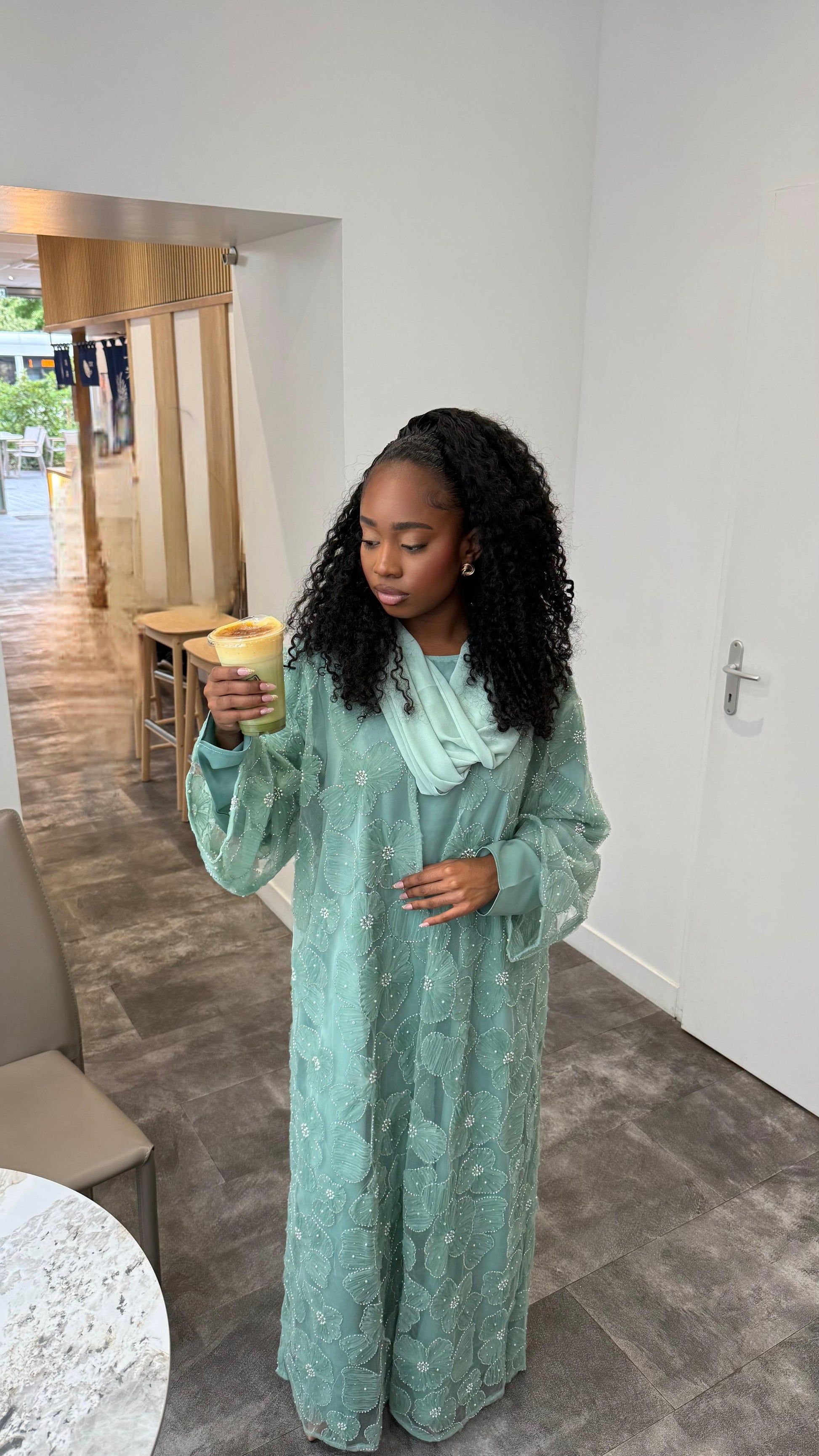 Un set trois pièces vert tendre composé d’un kimono fluide, d’une sous-robe légère et d’un hijab assorti. Entièrement brodé à la main, il apporte élégance et douceur, idéal pour vos occasions spéciales ou au quotidien.