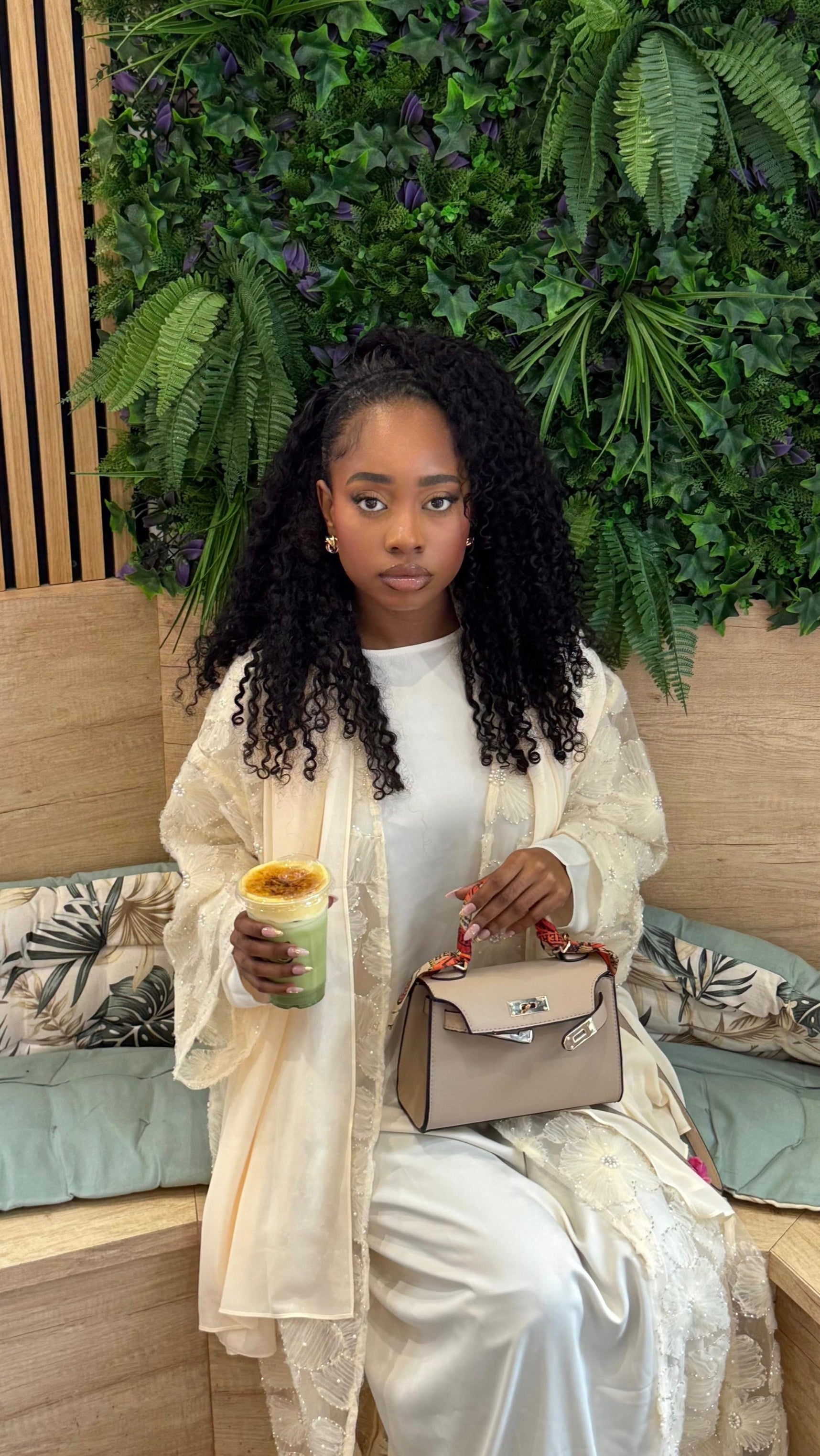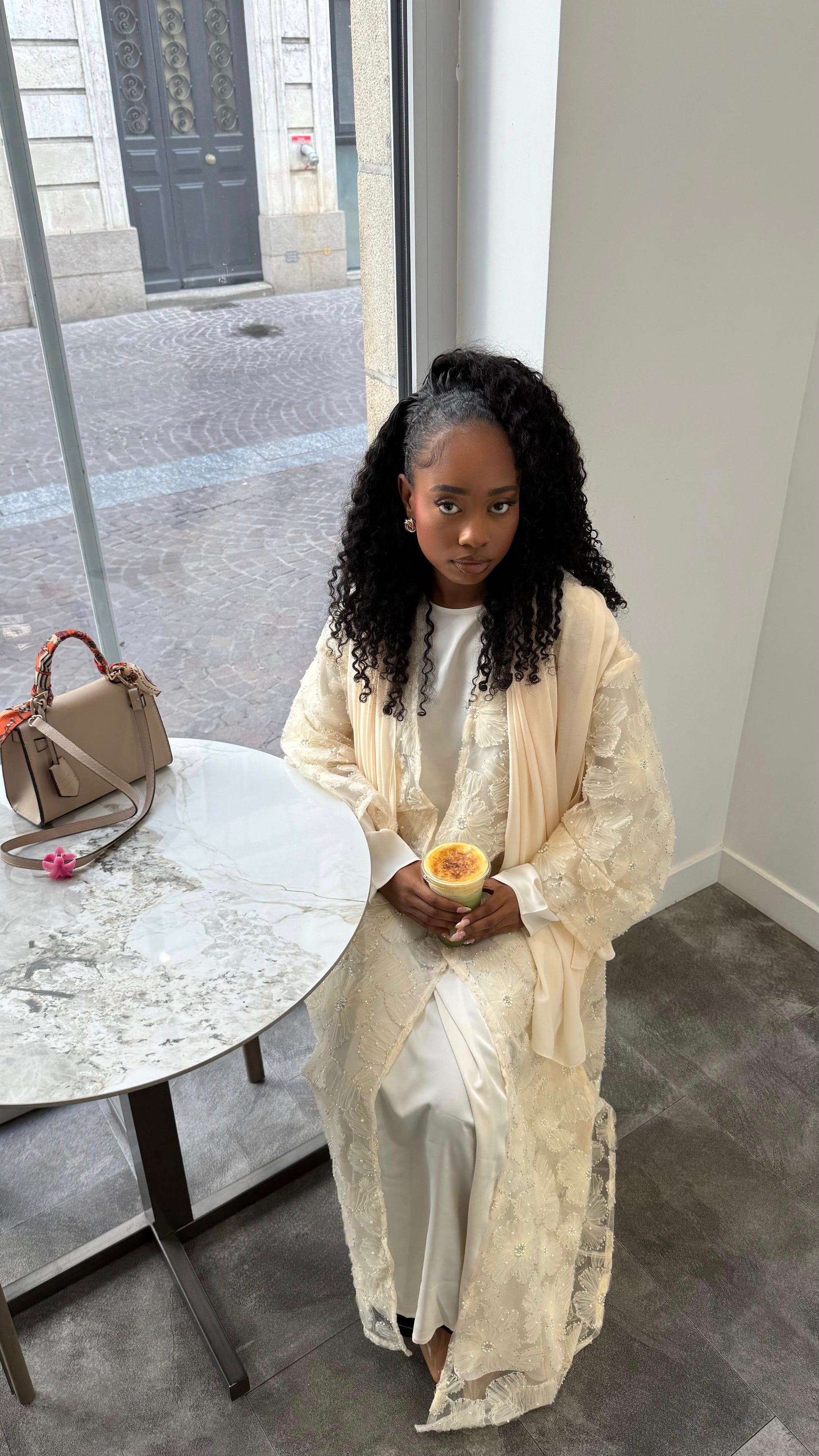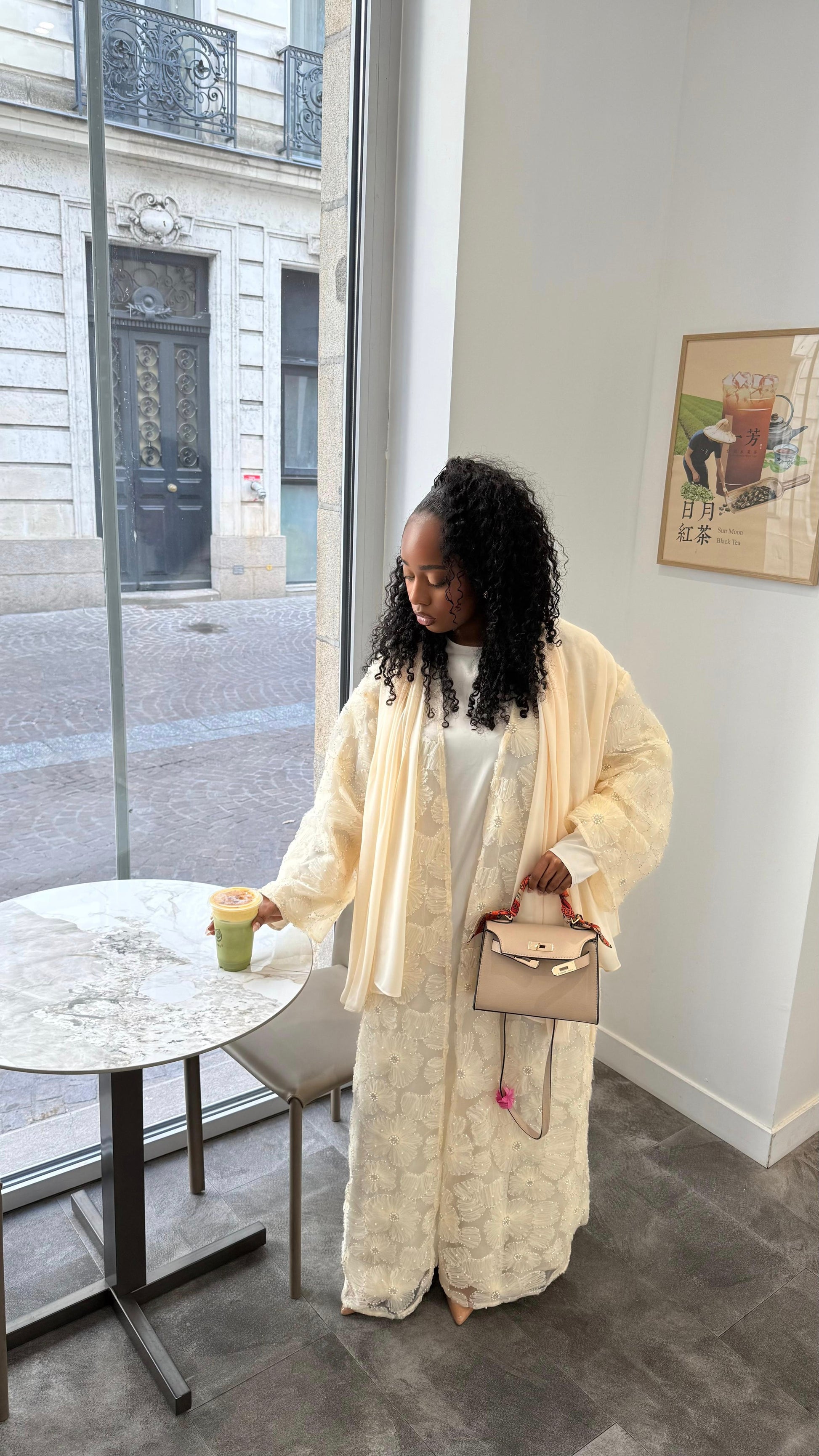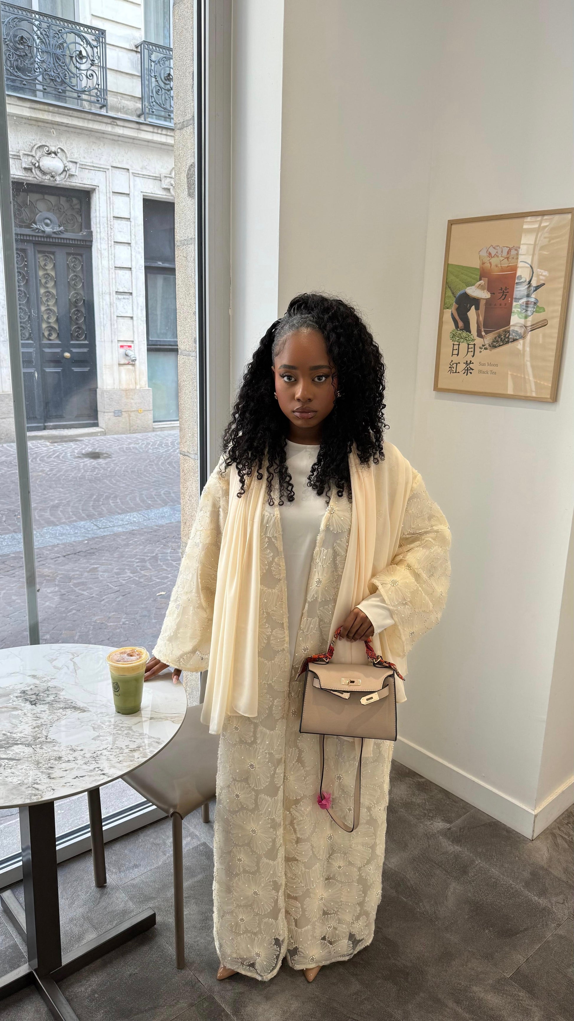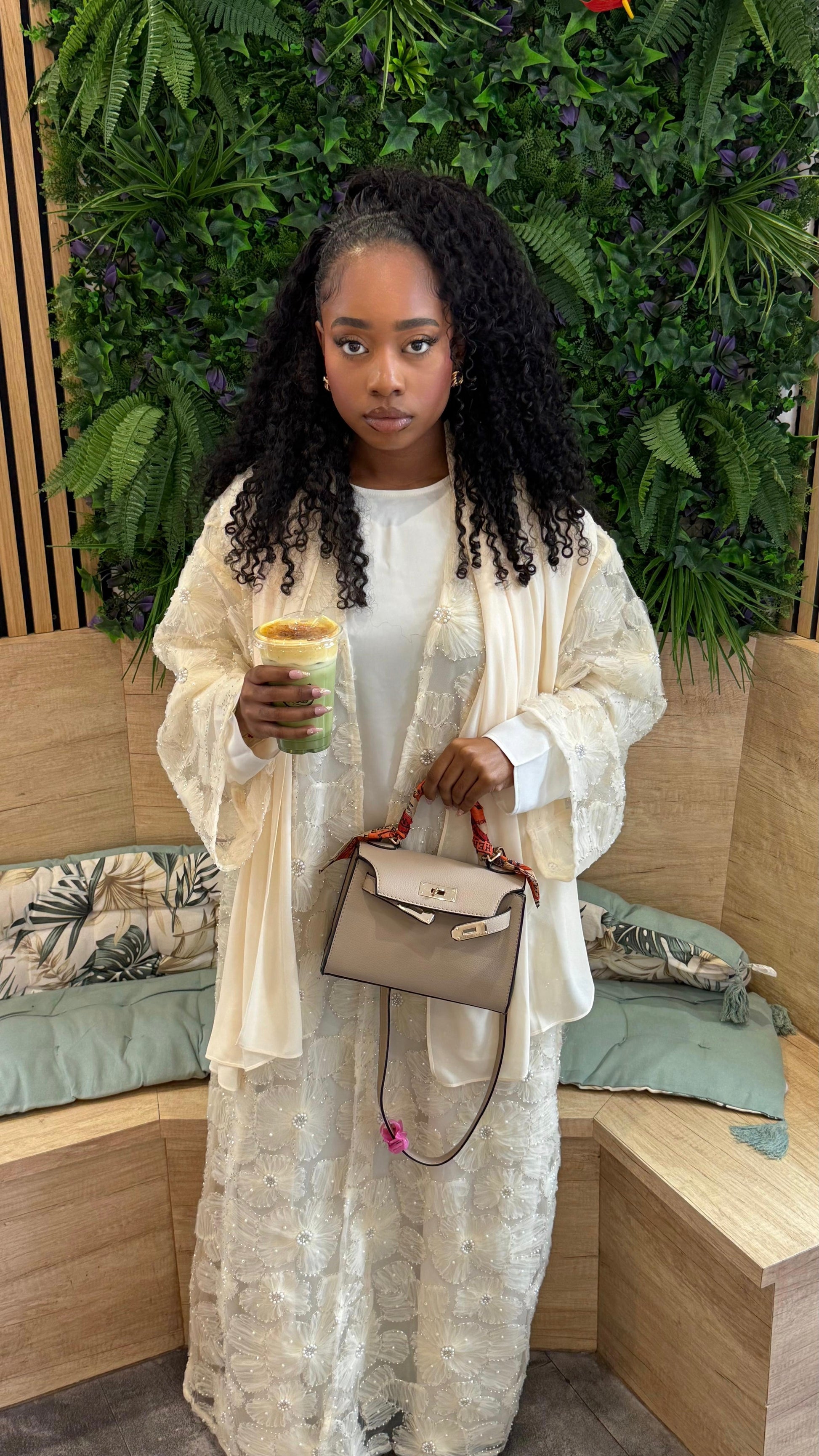 Un set trois pièces rose tendre composé d’un kimono fluide, d’une sous-robe légère et d’un hijab assorti. Entièrement brodé à la main, il apporte élégance et douceur, idéal pour vos occasions spéciales ou au quotidien.
